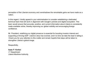 The letter emphasizes that a strong online image is crucial for attracting foreign investment and boosting Liberia’s economy.